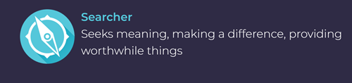 The Searcher is motivated by the need for meaning and wants to engage in activities that are valuable for their own sake. They seek work that is important and significant, not just for money or status. They strive to make a difference in the quality of work and life, always looking for something better or a cause to champion.